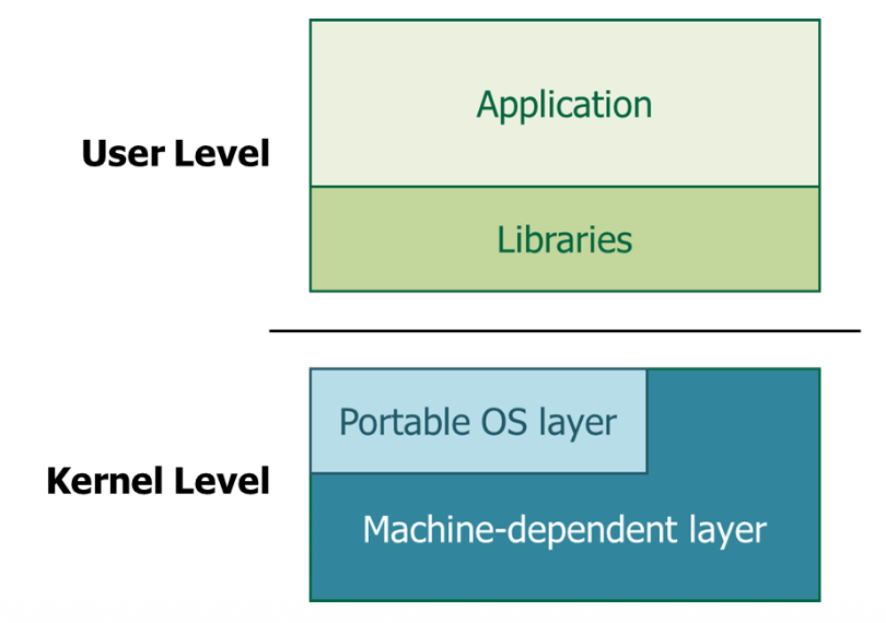 Machine-dependent Layer | 운영체제의 하위 부분 | 실제 하드웨어와 직접 상호작용 (드라이버, 인터럽트, 프로세서 제어 등) |