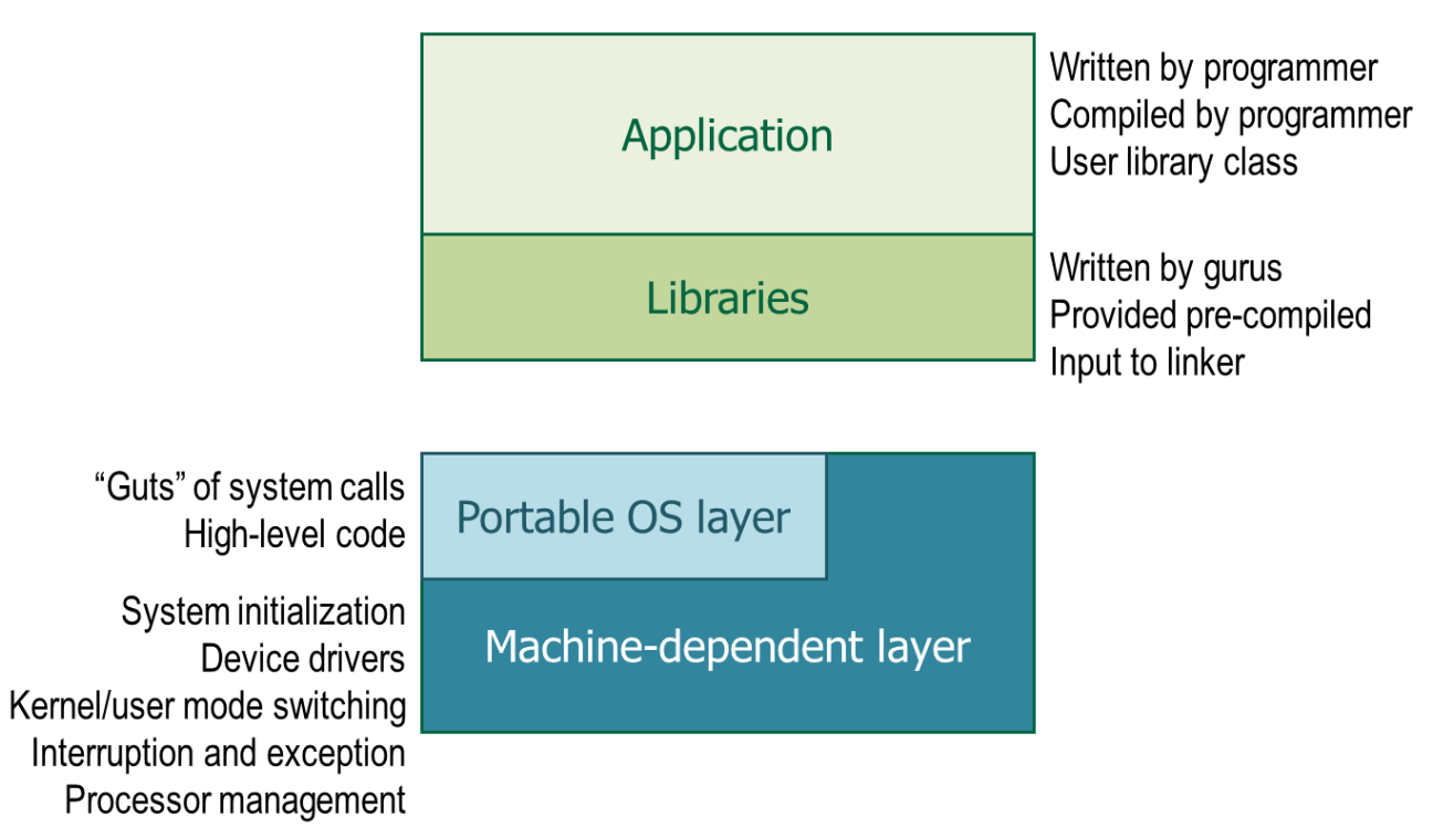 Libraries | 전문가(gurus)가 제작 후 제공 | OS 기능을 손쉽게 사용할 수 있도록 도와주는 API 모음. 컴파일 시 링크(link)되어 실행 파일에 포함됨 |