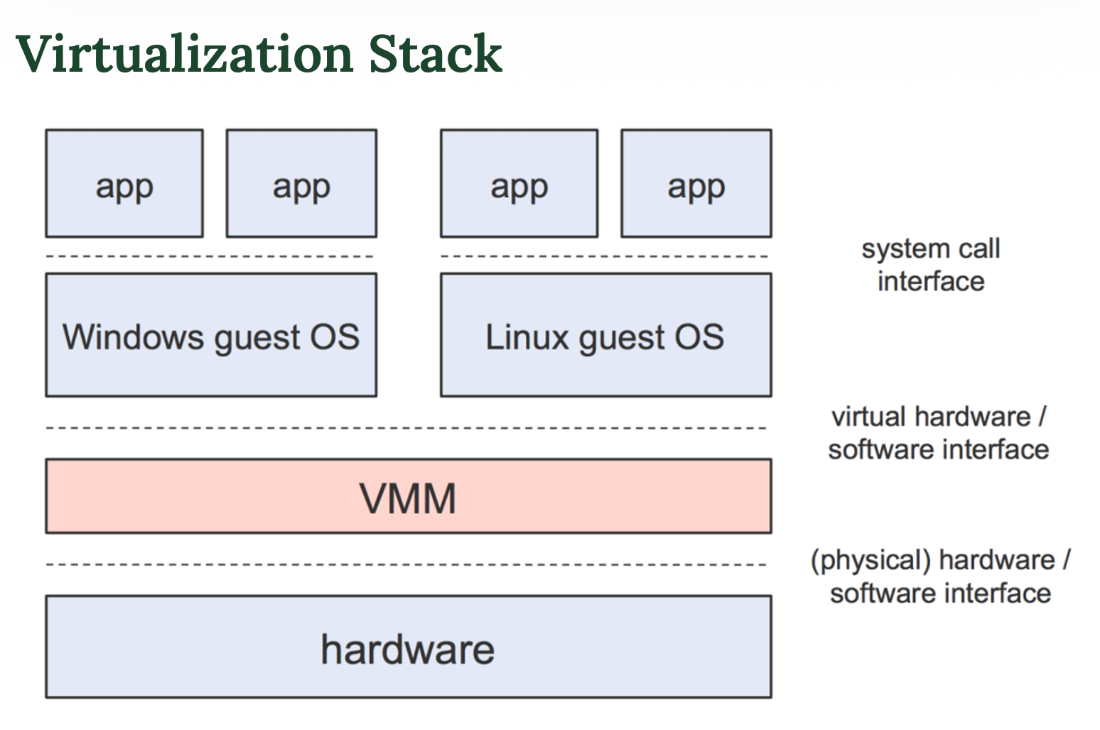 Virtualization Stack = Hardware + VMM(Hypervisor) + Guest OS + Applications